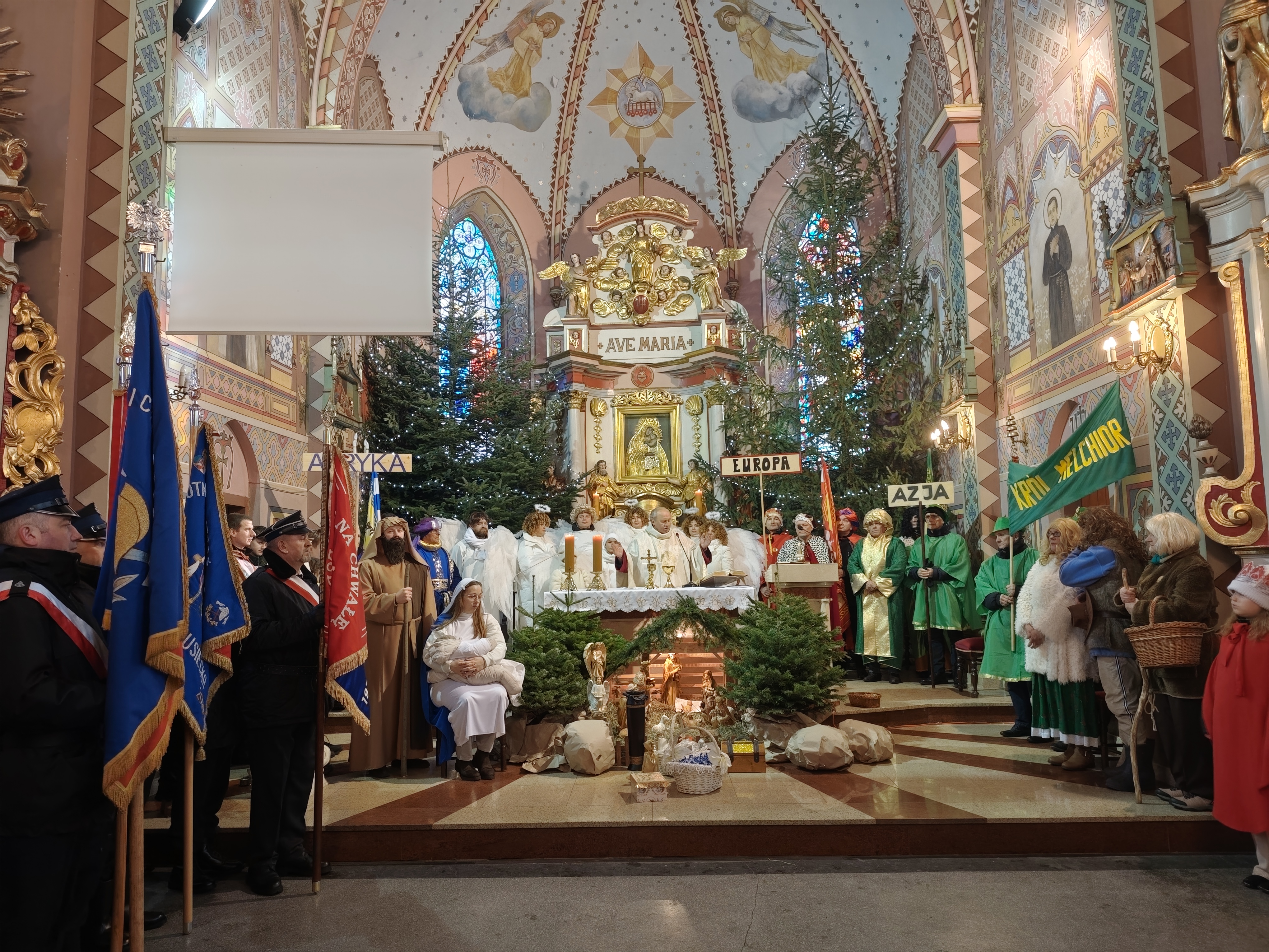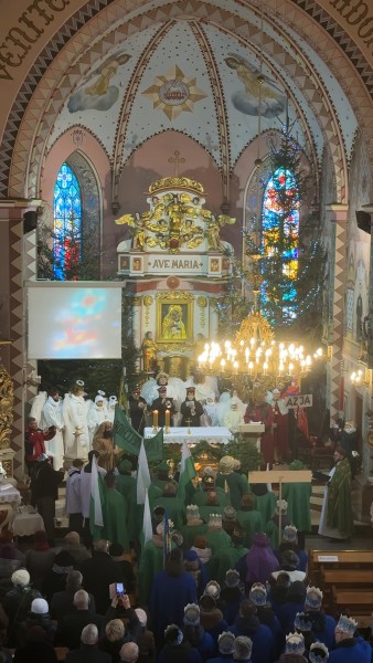 Trzej Królowie oddali pokłon i złożyli dary przed ołtarzem i szopką, po czym pokłon Dzieciątku Jezus składały grupy parafialne i gminne.