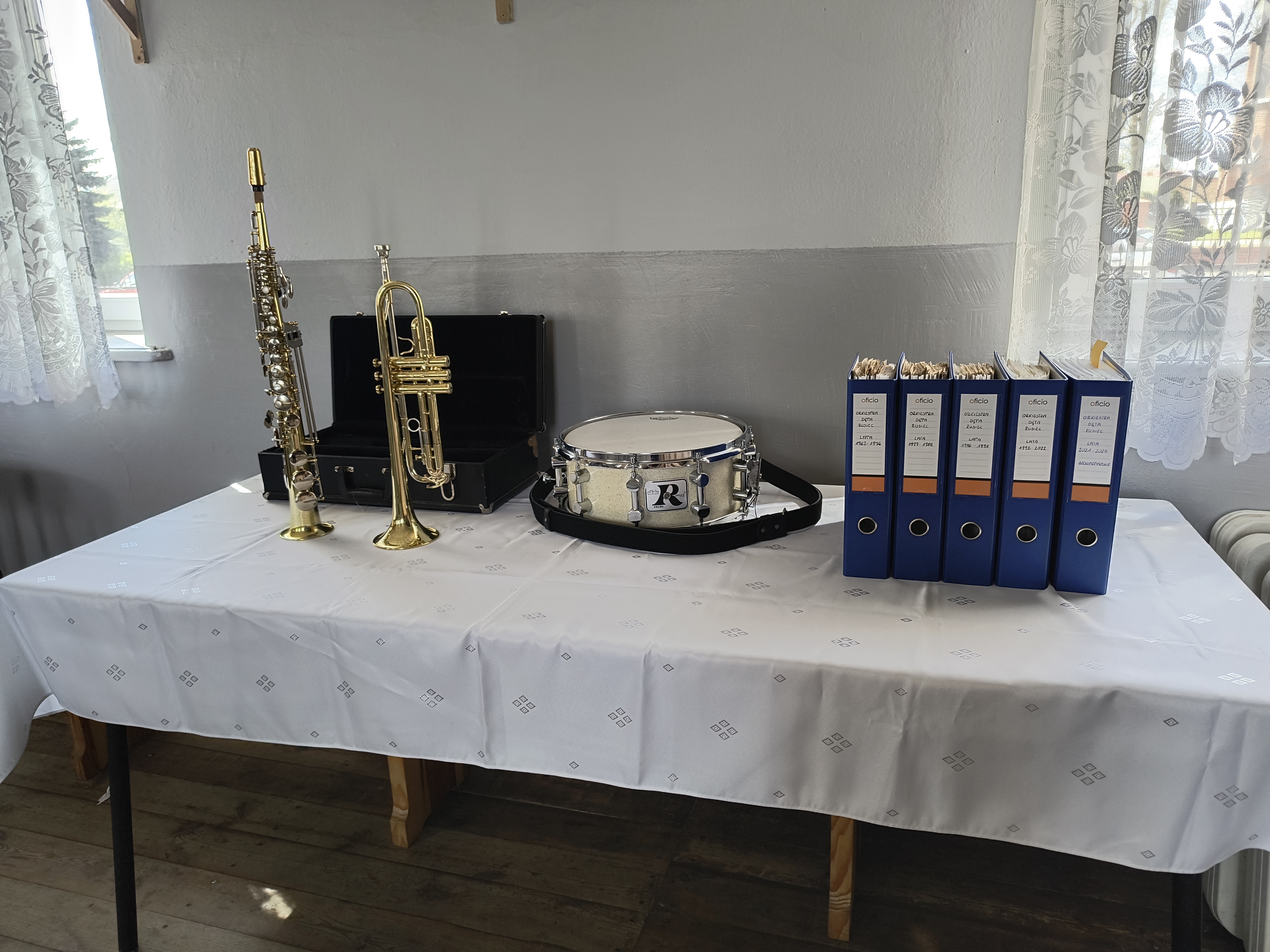 Zdjęcie przedstawia instrumenty po generalnym remoncie oraz utworzone archiwum orkiestry,